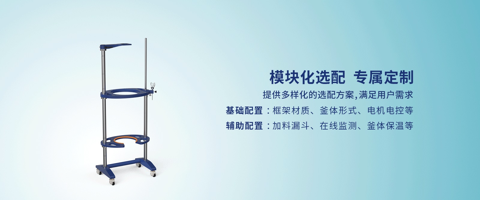 8、模塊化選配,提供多樣化的選配方案,滿足用戶需求。基礎(chǔ)配置:框架材質(zhì),釜體形式,電機(jī)電控等。輔助配置:加料漏斗,在線監(jiān)測(cè),釜體保溫等。