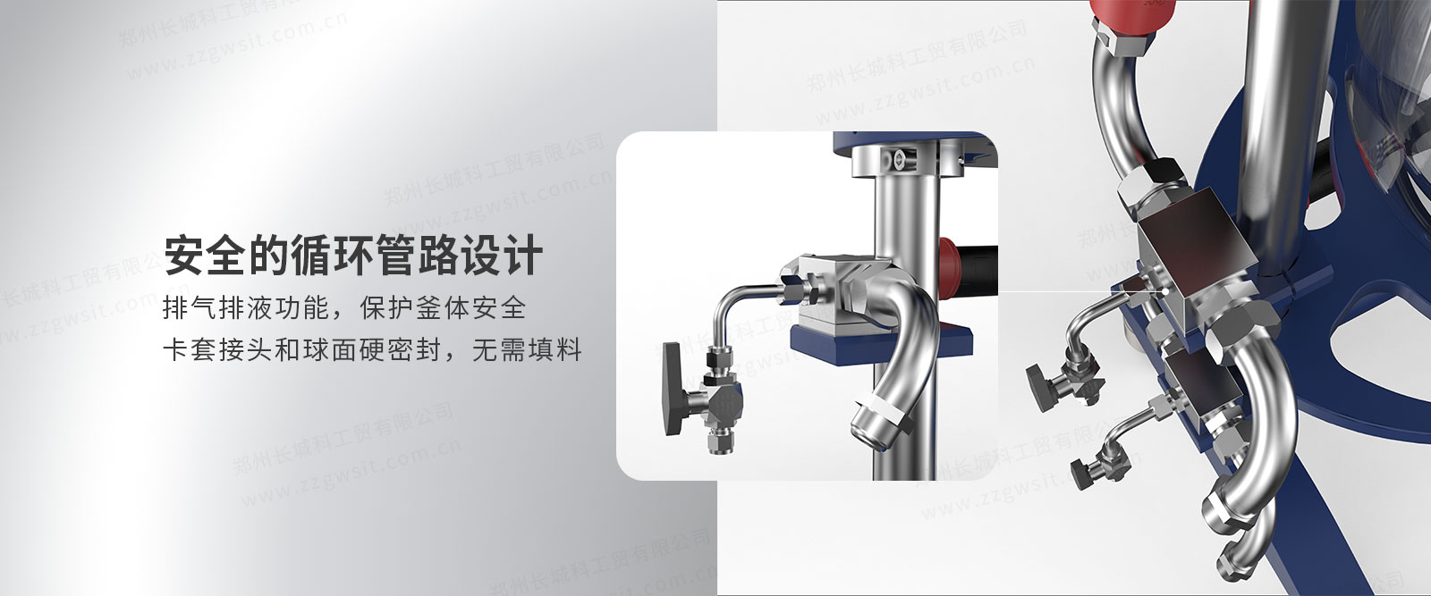 5、循環(huán)管路設(shè)計(jì)安全:排氣排液功能,保護(hù)釜體安全,卡套接頭和球面硬密封,無需填料;